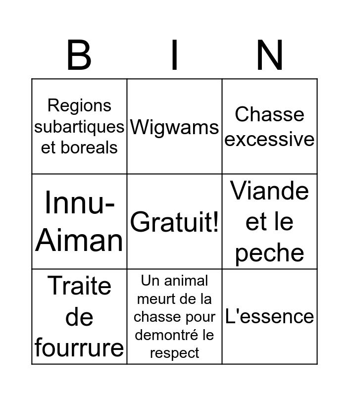 This bingo card has a free space and 8 words: Viande et le peche, Chasse excessive, Wigwams, Traite de fourrure, Regions subartiques et boreals, L'essence, Innu-Aiman and Un animal meurt de la chasse pour demontré le respect.