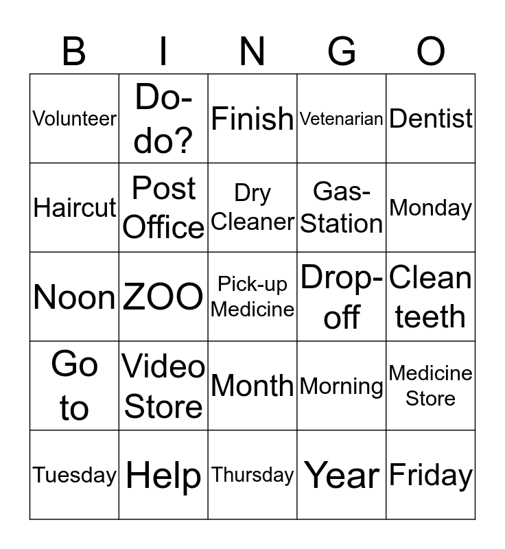 This bingo card has 38 words: Free!, Refuse, Not-mind, Post Office, Medicine Store, Video Store, Dry Cleaner, School, Dentist, Gas-Station, ZOO, Vetenarian, Pick-up Medicine, Clean teeth, Haircut, Go to, Must, Finish, Oh, I see, Drop-off, Volunteer, Help, Monday, Tuesday, Wednesday, Thursday, Friday, Saturday, Sunday, Week, Weekend, Month, Year, Do-do?, Night, Morning, Noon and Afternoon.