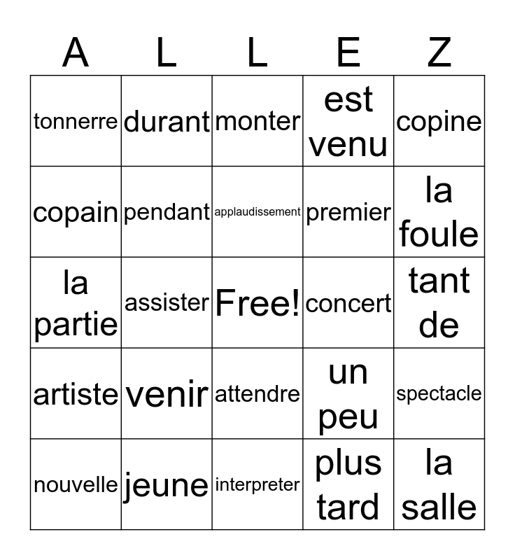 This bingo card has a free space and 24 words: venir, jeune, applaudissement, nouvelle, copine, tonnerre, copain, durant, concert, attendre, premier, la partie, un peu, spectacle, pendant, plus tard, tant de, monter, la foule, assister, la salle, artiste, est venu and interpreter.