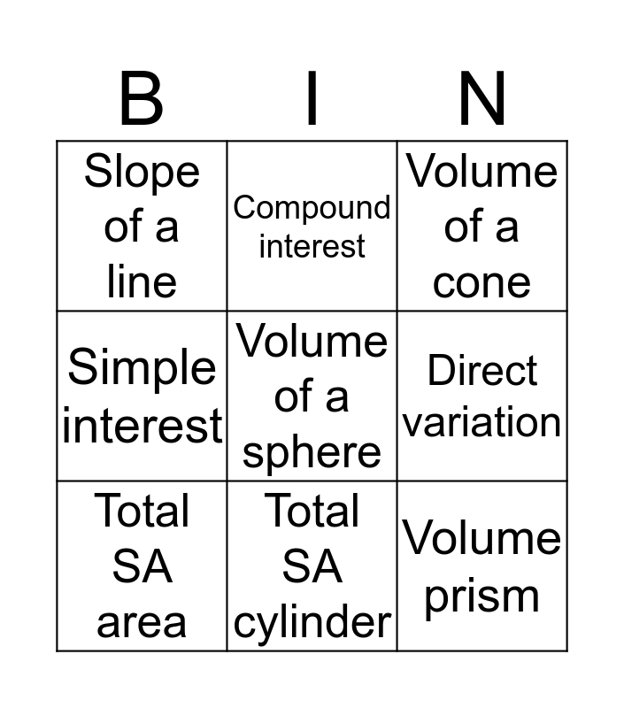 This bingo card has a free space and 8 words: Direct variation, Volume of a cone, Compound interest, Total SA area, Slope of a line, Volume prism, Simple interest and Total SA cylinder.