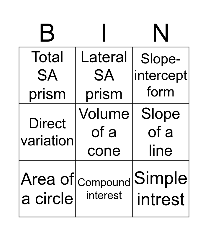 This bingo card has a free space and 8 words: Slope of a line, Slope-intercept form, Lateral SA prism, Area of a circle, Total SA prism, Simple intrest, Direct variation and Compound interest.