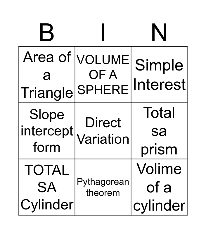 This bingo card has 9 words: TOTAL SA Cylinder, Direct Variation, Simple Interest, Area of a Triangle, VOLUME OF A SPHERE, Total sa prism, Slope intercept form, Pythagorean theorem and Volime of a cylinder.
