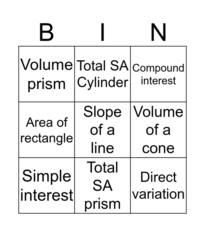 This bingo card has a free space and 8 words: Volume of a cone, Compound interest, Total SA Cylinder, Simple interest, Volume prism, Direct variation, Area of rectangle and Total SA prism.