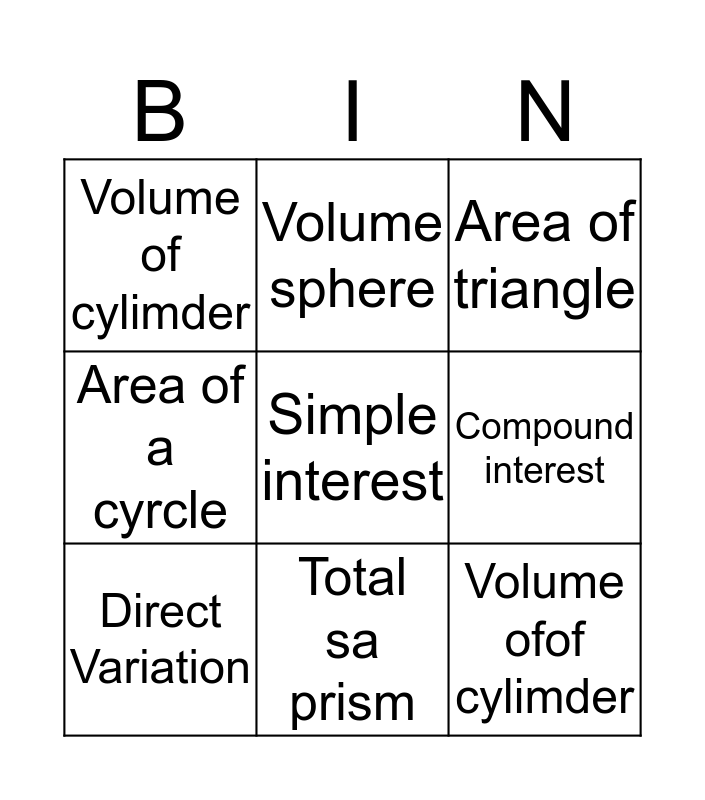 This bingo card has a free space and 9 words: Direct Variation, Volume sphere, Compound interest, Volume of cylimder, Area of triangle, Area of a cyrcle, Total sa prism, Pythagorean therom and Volume ofof cylimder.