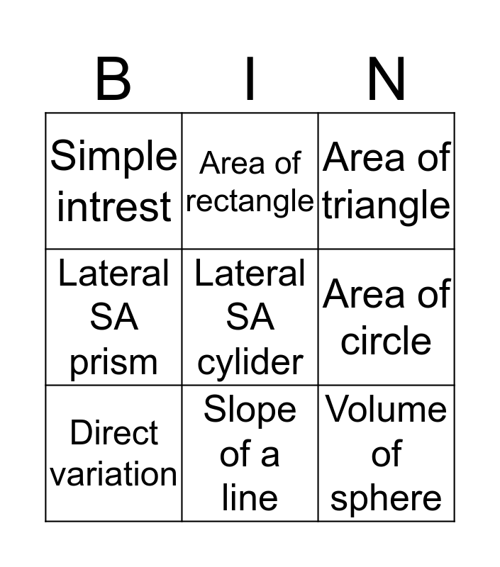 This bingo card has a free space and 8 words: Area of circle, Area of triangle, Area of rectangle, Direct variation, Simple intrest, Volume of sphere, Lateral SA prism and Slope of a line.
