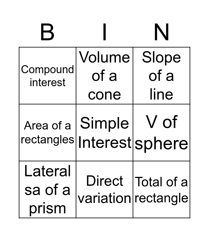 This bingo card has a free space and 8 words: V of sphere, Slope of a line, Volume of a cone, Lateral sa of a prism, Compound interest, Total of a rectangle, Area of a rectangles and Direct variation.