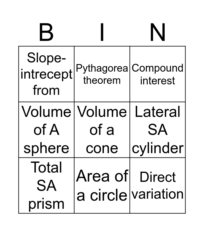 This bingo card has a free space and 8 words: Lateral SA cylinder, Compound interest, Pythagorea theorem, Total SA prism, Slope-intrecept from, Direct variation, Volume of A sphere and Area of a circle.