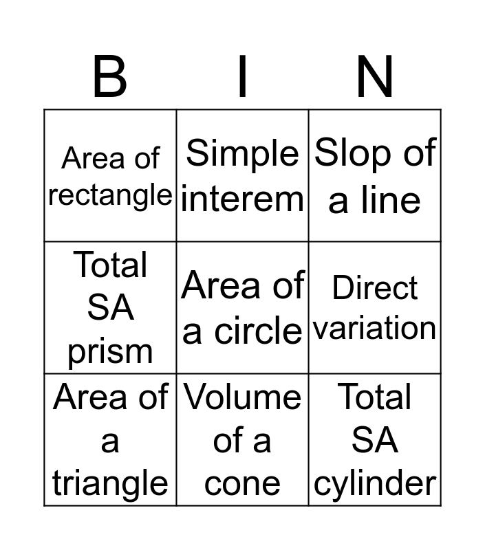 This bingo card has a free space and 8 words: Direct variation, Slop of a line, Simple interem, Area of a triangle, Area of rectangle, Total SA cylinder, Total SA prism and Volume of a cone.