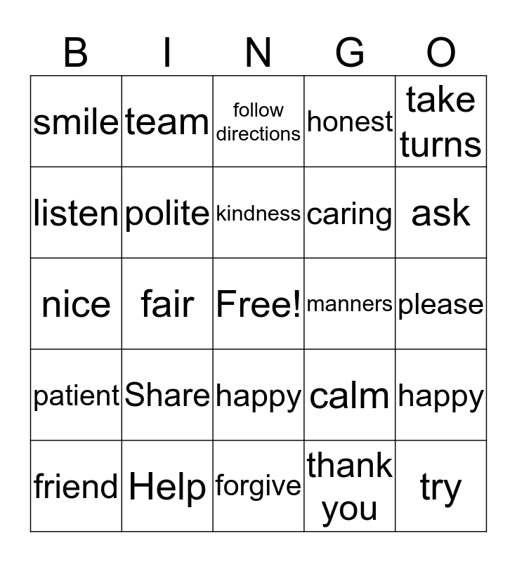 This bingo card has a free space and 24 words: Share, Help, kindness, friend, take turns, smile, listen, team, manners, happy, caring, nice, calm, happy, polite, thank you, please, follow directions, ask, fair, try, patient, honest and forgive.