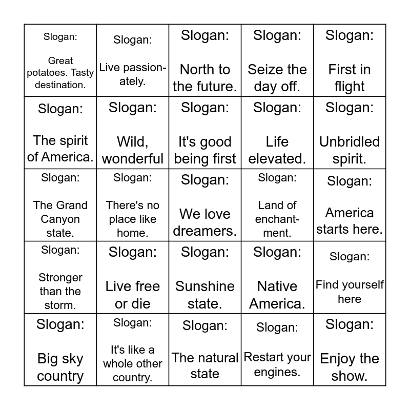 This bingo card has 25 words: Slogan: Live free or die, Slogan: The natural state, Slogan: It's good being first, Slogan: Big sky country, Slogan: First in flight, Slogan: Great potatoes. Tasty destination., Slogan: The spirit of America., Slogan: Live passion-ately., Slogan: Land of enchant-ment., Slogan: Sunshine state., Slogan: Life elevated., Slogan: The Grand Canyon state., Slogan: Native America., Slogan: Find yourself here, Slogan: Wild, wonderful, Slogan: Enjoy the show., Slogan: America starts here., Slogan: North to the future., Slogan: Unbridled spirit., Slogan: There's no place like home., Slogan: We love dreamers., Slogan: It's like a whole other country., Slogan: Stronger than the storm., Slogan: Seize the day off. and Slogan: Restart your engines..