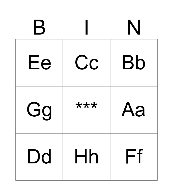 This bingo card has a free space and 8 words: Aa, Bb, Cc, Dd, Ee, Ff, Gg and Hh.