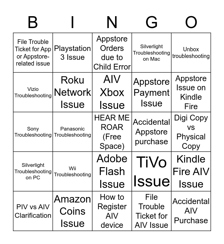 This bingo card has a free space and 24 words: Wii Troubleshooting, Amazon Coins Issue, AIV Xbox Issue, PIV vs AIV Clarification, Unbox troubleshooting, File Trouble Ticket for App or Appstore-related issue, Vizio Troubleshooting, Playstation 3 Issue, Accidental Appstore purchase, Adobe Flash Issue, Appstore Payment Issue, Sony Troubleshooting, TiVo Issue, Kindle Fire AIV Issue, Roku Network Issue, File Trouble Ticket for AIV Issue, Digi Copy vs Physical Copy, Appstore Orders due to Child Error, Appstore Issue on Kindle Fire, Panasonic Troubleshooting, Accidental AIV Purchase, Silverlight Troubleshooting on PC, Silverlight Troubleshooting on Mac and How to Register AIV device.