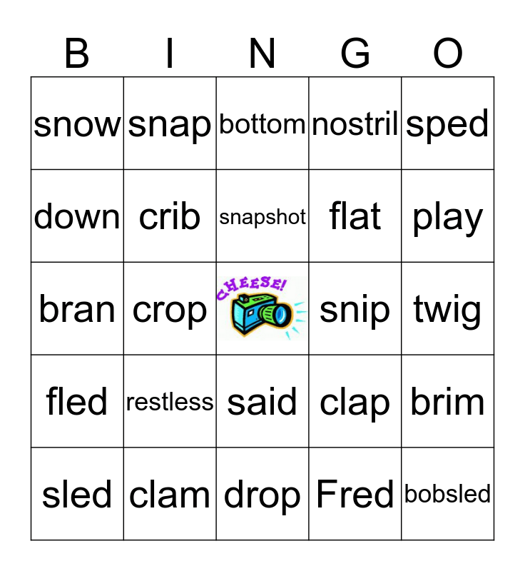 This bingo card has a free space and 24 words: restless, clam, snapshot, sled, sped, snow, down, snap, snip, said, flat, bran, clap, brim, crib, Fred, twig, bottom, play, crop, bobsled, fled, nostril and drop.