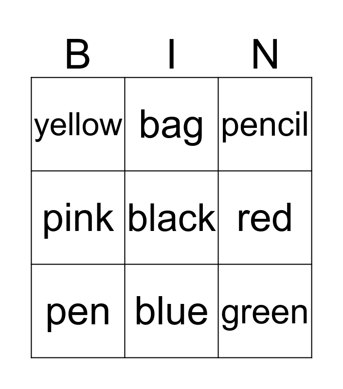 This bingo card has 11 words: green, blue, black, pen, bag, pencil, red, book, pink, yellow and white.