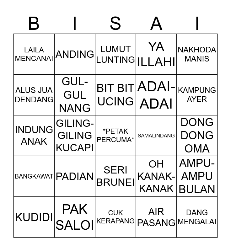 This bingo card has a free space and 24 words: PADIAN, PAK SALOI, BIT BIT UCING, KUDIDI, NAKHODA MANIS, LAILA MENCANAI, ALUS JUA DENDANG, ANDING, SAMALINDANG, SERI BRUNEI, ADAI-ADAI, INDUNG ANAK, OH KANAK-KANAK, AMPU-AMPU BULAN, GUL-GUL NANG, AIR PASANG, DONG DONG OMA, LUMUT LUNTING, KAMPUNG AYER, GILING-GILING KUCAPI, DANG MENGALAI, BANGKAWAT, YA ILLAHI and CUK KERAPANG.