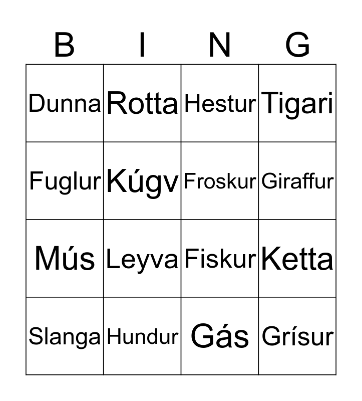 This bingo card has 16 words: Hundur, Ketta, Hestur, Dunna, Mús, Rotta, Fiskur, Gás, Fuglur, Kúgv, Slanga, Tigari, Leyva, Giraffur, Froskur and Grísur.