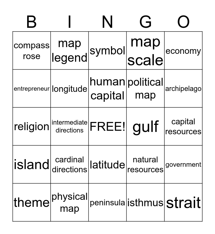 This bingo card has a free space and 24 words: cardinal directions, physical map, human capital, theme, economy, compass rose, entrepreneur, map legend, gulf, latitude, political map, religion, natural resources, government, longitude, isthmus, capital resources, symbol, archipelago, intermediate directions, strait, island, map scale and peninsula.