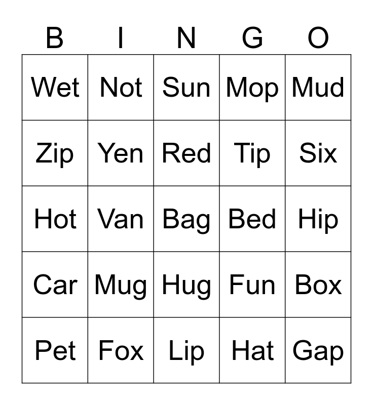 This bingo card has a free space and 24 words: Pet, Mug, Red, Hat, Mud, Wet, Not, Sun, Bed, Hip, Hot, Yen, Fun, Box, Zip, Fox, Lip, Mop, Six, Car, Van, Hug, Tip and Gap.