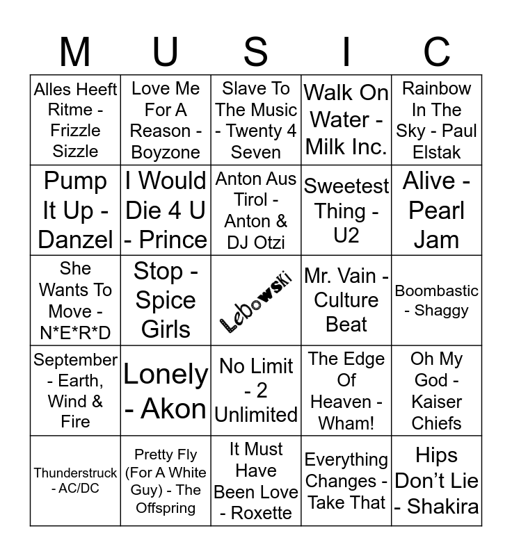 This bingo card has a free space and 24 words: Lonely - Akon, Pretty Fly (For A White Guy) - The Offspring, Anton Aus Tirol - Anton & DJ Otzi, Thunderstruck - AC/DC, Rainbow In The Sky - Paul Elstak, Alles Heeft Ritme - Frizzle Sizzle, Pump It Up - Danzel, Love Me For A Reason - Boyzone, Mr. Vain - Culture Beat, No Limit - 2 Unlimited, Sweetest Thing - U2, She Wants To Move - N*E*R*D, The Edge Of Heaven - Wham!, Oh My God - Kaiser Chiefs, I Would Die 4 U - Prince, Everything Changes - Take That, Boombastic - Shaggy, Slave To The Music - Twenty 4 Seven, Alive - Pearl Jam, Stop - Spice Girls, Hips Don’t Lie - Shakira, September - Earth, Wind & Fire, Walk On Water - Milk Inc. and It Must Have Been Love - Roxette.