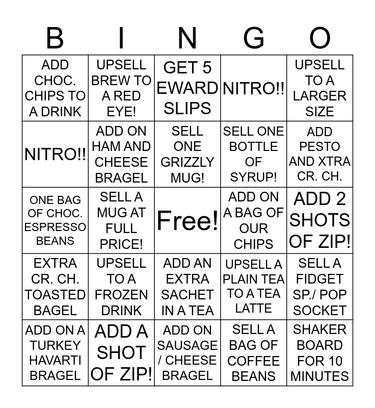 This bingo card has a free space and 24 words: UPSELL TO A FROZEN DRINK, ADD A SHOT OF ZIP!, SELL ONE GRIZZLY MUG!, ADD ON A TURKEY HAVARTI BRAGEL, UPSELL TO A LARGER SIZE, ADD CHOC. CHIPS TO A DRINK, NITRO!!, UPSELL BREW TO A RED EYE!, ADD ON A BAG OF OUR CHIPS, ADD AN EXTRA SACHET IN A TEA, SELL ONE BOTTLE OF SYRUP!, ONE BAG OF CHOC. ESPRESSO BEANS, UPSELL A PLAIN TEA TO A TEA LATTE, SELL A FIDGET SP./ POP SOCKET, ADD ON HAM AND CHEESE BRAGEL, SELL A BAG OF COFFEE BEANS, ADD 2 SHOTS OF ZIP!, GET 5 EWARD SLIPS, ADD PESTO AND XTRA CR. CH., SELL A MUG AT FULL PRICE!, SHAKER BOARD FOR 10 MINUTES, EXTRA CR. CH. TOASTED BAGEL, NITRO!! and ADD ON SAUSAGE / CHEESE BRAGEL.