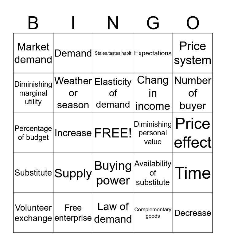 This bingo card has a free space and 24 words: Supply, Free enterprise, Elasticity of demand, Volunteer exchange, Price system, Market demand, Diminishing marginal utility, Demand, Diminishing personal value, Buying power, Chang in income, Percentage of budget, Availability of substitute, Time, Weather or season, Complementary goods, Price effect, Stales,tastes,habit, Number of buyer, Increase, Decrease, Substitute, Expectations and Law of demand.
