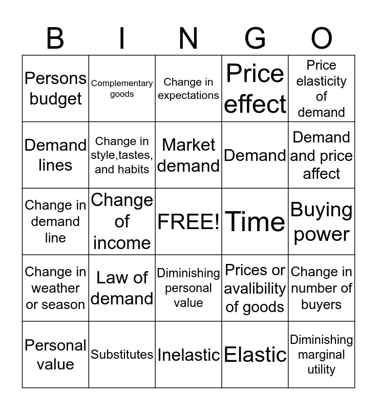 This bingo card has a free space and 24 words: Law of demand, Substitutes, Market demand, Personal value, Price elasticity of demand, Persons budget, Demand lines, Complementary goods, Time, Diminishing personal value, Demand, Change in demand line, Prices or avalibility of goods, Change in number of buyers, Change in style,tastes, and habits, Elastic, Buying power, Change in expectations, Demand and price affect, Change of income, Diminishing marginal utility, Change in weather or season, Price effect and Inelastic.