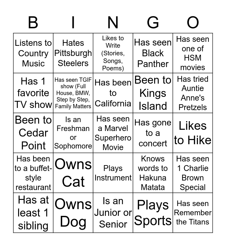 This bingo card has a free space and 24 words: Owns Cat, Owns Dog, Has been to California, Has at least 1 sibling, Has seen one of HSM movies, Listens to Country Music, Has 1 favorite TV show, Hates Pittsburgh Steelers, Has gone to a concert, Plays Instrument, Been to Kings Island, Been to Cedar Point, Knows words to Hakuna Matata, Has seen 1 Charlie Brown Special, Has seen TGIF show (Full House, BMW, Step by Step, Family Matters, Plays Sports, Likes to Hike, Likes to Write (Stories, Songs, Poems), Has tried Auntie Anne's Pretzels, Is an Freshman or Sophomore, Has seen Remember the Titans, Has been to a buffet-style restaurant, Has seen Black Panther and Is an Junior or Senior.