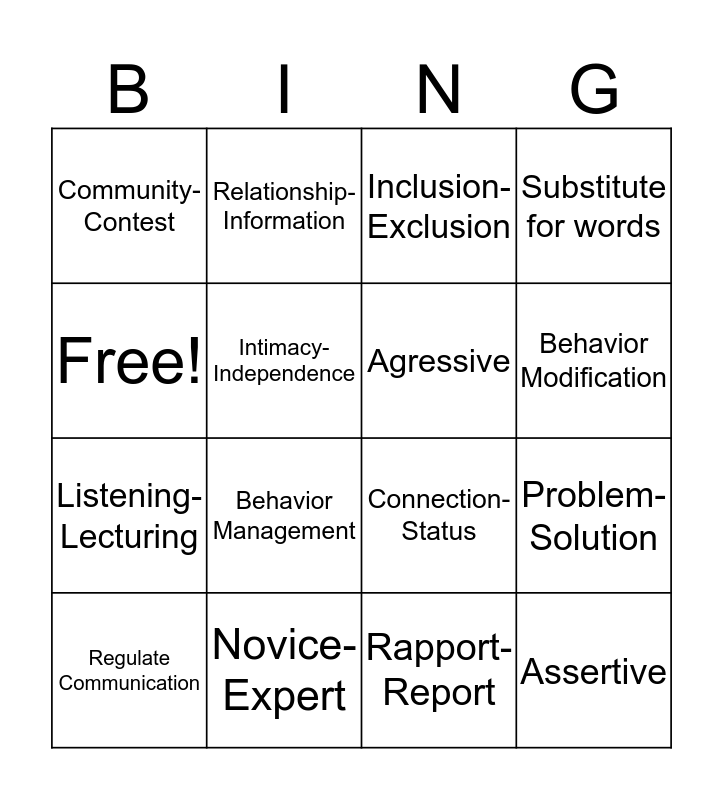 This bingo card has 16 words: Novice-Expert, Problem-Solution, Inclusion-Exclusion, Community-Contest, Listening-Lecturing, Relationship-Information, Connection-Status, Rapport-Report, Free!, Intimacy-Independence, Regulate Communication, Substitute for words, Behavior Management, Behavior Modification, Agressive and Assertive.