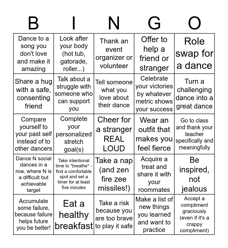 This bingo card has a free space and 24 words: Take intentional time to *breathe* - find a comfortable spot and set a timer for at least five minutes, Eat a healthy breakfast, Tell someone what you love about their dance, Accumulate some failure, because failure helps future you be better!, Role swap for a dance, Dance to a song you don't love and make it amazing, Share a hug with a safe, consenting friend, Look after your body (hot tub, gatorade, roller...), Wear an outfit that makes you feel fierce, Take a nap (and zen fire zee missiles!), Celebrate your victories by whatever metric shows your success, Compare yourself to your past self instead of to other dancers, Acquire a treat and share it with your roommates, Be inspired, not jealous, Talk about a struggle with someone who can support you, Make a list of new things you learned and want to practice, Go to class and thank your teacher specifically and meaningfully, Thank an event organizer or volunteer, Turn a challenging dance into a great dance, Complete your personalized stretch goal(s), Accept a compliment graciously (even if it's a crappy compliment), Dance N social dances in a row, where N is a difficult but achievable target, Offer to help a friend or stranger and Take a risk because you are too brave to play it safe.