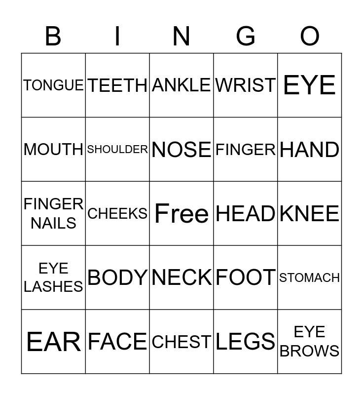 This bingo card has a free space and 24 words: BODY, FACE, NOSE, EAR, EYE, TONGUE, MOUTH, TEETH, HEAD, NECK, FINGER, FINGER NAILS, FOOT, STOMACH, SHOULDER, LEGS, KNEE, ANKLE, HAND, CHEEKS, EYE BROWS, EYE LASHES, WRIST and CHEST.