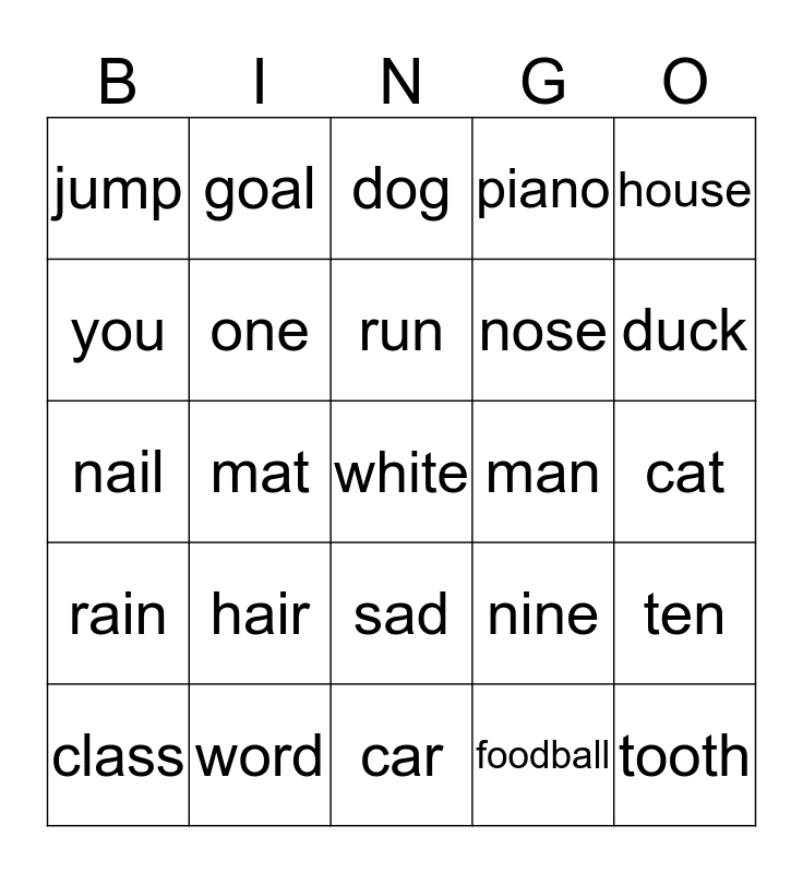 This bingo card has 25 words: hair, car, run, class, house, jump, you, goal, man, sad, nose, nail, nine, ten, one, tooth, cat, dog, duck, mat, white, word, rain, piano and foodball.