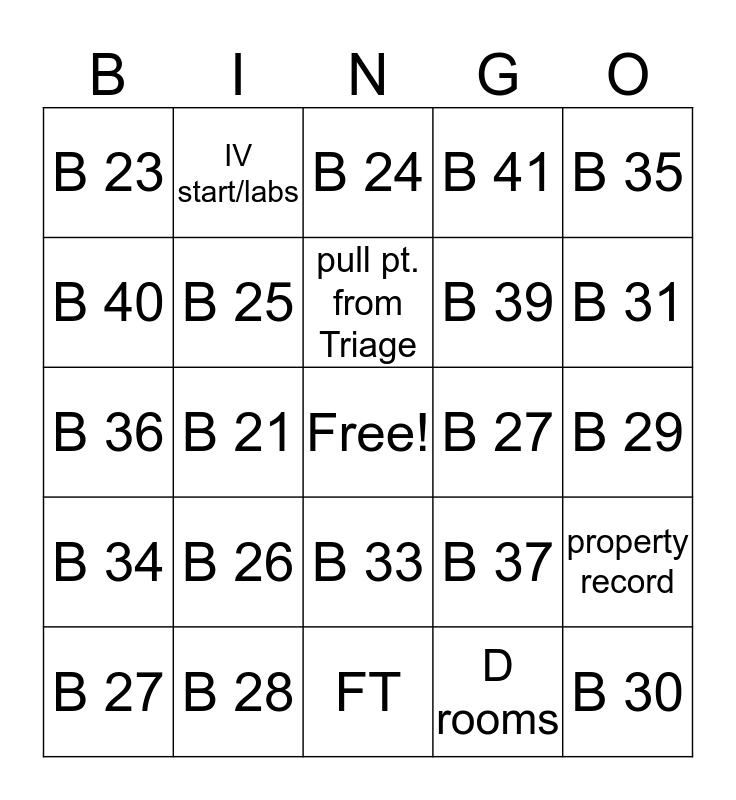 This bingo card has a free space and 29 words: B 27, EKG, B 21, B 22, B 23, B 24, B 25, B 26, B 27, B 28, B 29, B 30, FT, D rooms, B 31, B 32, B 33, B 34, B 35, B 36, B 37, B 38, B 39, B 40, B 41, IV start/labs, property record, pull pt. from Triage and Bathroom Assistance.