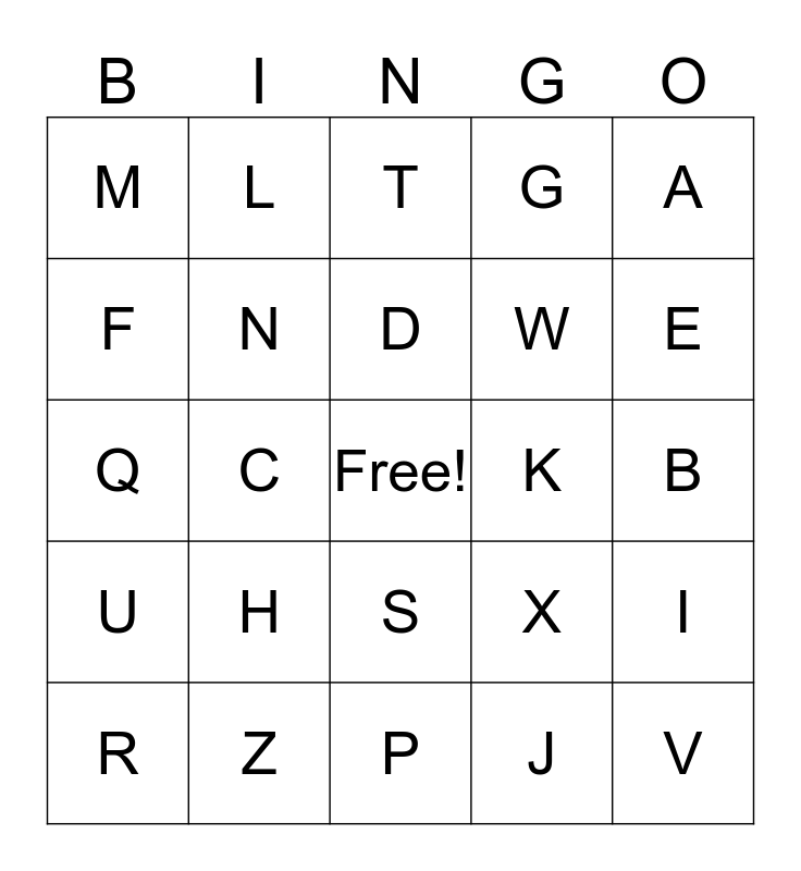 This bingo card has a free space and 24 words: H, Z, D, R, A, M, F, L, K, S, W, Q, X, I, N, J, B, T, E, C, V, U, G and P.