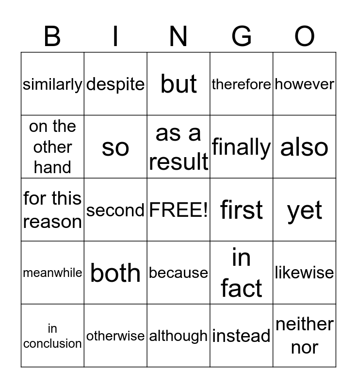 This bingo card has a free space and 24 words: both, otherwise, as a result, in conclusion, however, similarly, on the other hand, despite, first, because, finally, for this reason, in fact, likewise, so, instead, yet, but, also, second, neither nor, meanwhile, therefore and although.