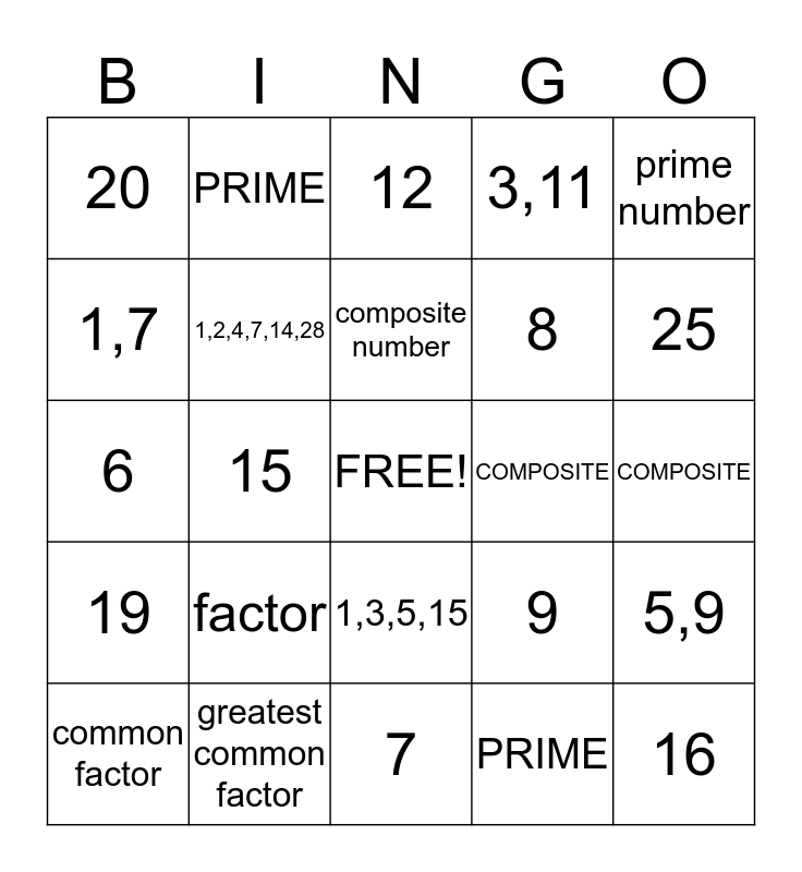 This bingo card has a free space and 24 words: factor, greatest common factor, composite number, common factor, prime number, 20, 1,7, PRIME, COMPOSITE, 1,3,5,15, 8, 6, 9, 5,9, 1,2,4,7,14,28, PRIME, COMPOSITE, 12, 25, 15, 16, 19, 3,11 and 7.