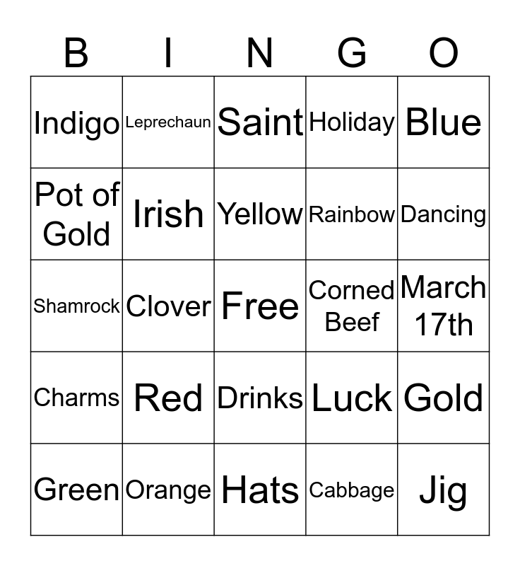This bingo card has a free space and 24 words: Red, Orange, Yellow, Green, Blue, Indigo, Pot of Gold, Leprechaun, Corned Beef, Drinks, Rainbow, Shamrock, Luck, Gold, Irish, Cabbage, March 17th, Saint, Dancing, Clover, Jig, Charms, Holiday and Hats.