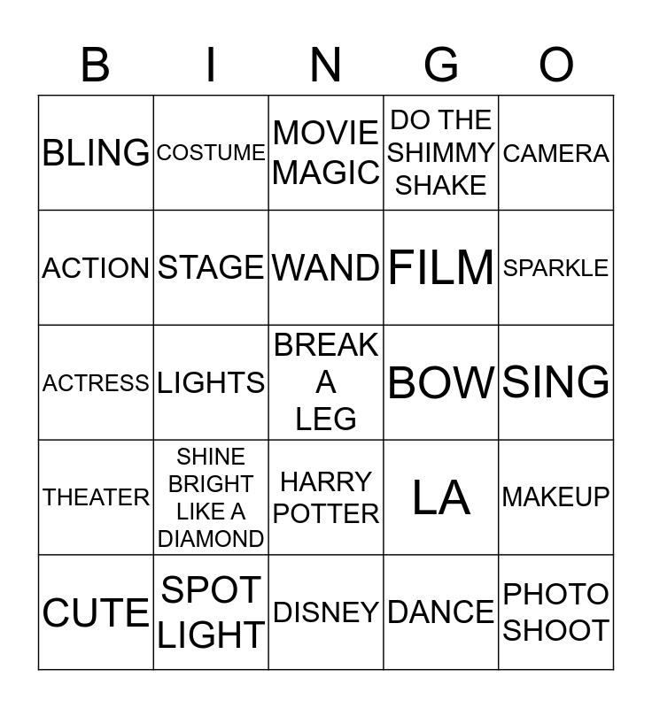 This bingo card has 25 words: SHINE BRIGHT LIKE A DIAMOND, DISNEY, WAND, CUTE, CAMERA, BLING, ACTION, COSTUME, BOW, HARRY POTTER, FILM, ACTRESS, LA, MAKEUP, STAGE, PHOTO SHOOT, SING, MOVIE MAGIC, SPARKLE, LIGHTS, BREAK A LEG, SPOT LIGHT, THEATER, DO THE SHIMMY SHAKE and DANCE.