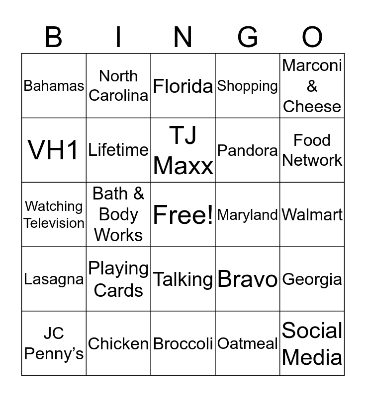 This bingo card has a free space and 25 words: Lasagna, Chicken, Broccoli, Oatmeal, Marconi & Cheese, Bahamas, North Carolina, Florida, Maryland, Georgia, VH1, Lifetime, BET, Bravo, Food Network, JC Penny’s, Bath & Body Works, TJ Maxx, Pandora, Walmart, Watching Television, Playing Cards, Talking, Shopping and Social Media.