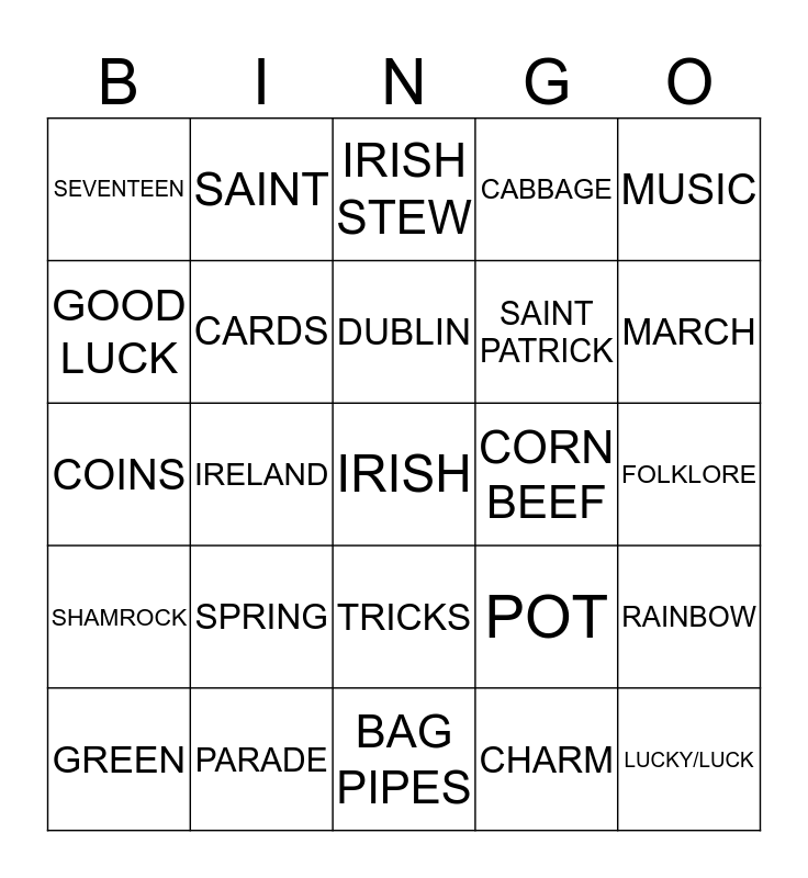 This bingo card has 45 words: Free!, IRISH, IRISH JIG, GREEN, HAT, CHARM, IRISH STEW, LEGEND, MUSIC, PARADE, CABBAGE, CORN BEEF, TRICKS, SPRING, POTATOES, BAG PIPES, CLOVER, COINS, BLARNEY STONE, MARCH, SAINT, DANCE, HOLIDAY, SEVENTEEN, FOOD, FOLKLORE, PADDY, GOLD, POT, SHAMROCK, LEPRECHAUN, RAINBOW, BEER, FIDDLE, SNAKES, IRELAND, LIMERICK, PIPE, LUCKY/LUCK, DUBLIN, GOOD LUCK, SAINT PATRICK, POEMS, CARDS and GREEN BEER.