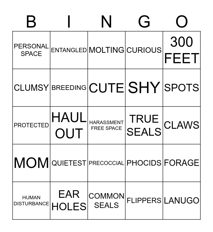 This bingo card has a free space and 31 words: COMMON SEALS, MMPA, HAUL OUT, PUPS, PERSONAL SPACE, MOLTING, BREEDING, PHOCIDS, TRUE SEALS, FLIPPERS, CLAWS, LANUGO, COAT, RINGS, SPOTS, RED, FORAGE, QUIETEST, MOM, PRECOCCIAL, 300 FEET, OCTOPUS, HUMAN DISTURBANCE, ENTANGLED, SHY, CLUMSY, CURIOUS, PROTECTED, EAR HOLES, CUTE and SWEET.