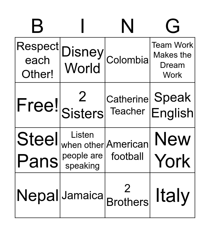 This bingo card has 16 words: Jamaica, New York, Colombia, Respect each Other!, Steel Pans, Disney World, American football, 2 Brothers, Free!, 2 Sisters, Nepal, Team Work Makes the Dream Work, Listen when other people are speaking, Speak English, Catherine Teacher and Italy.