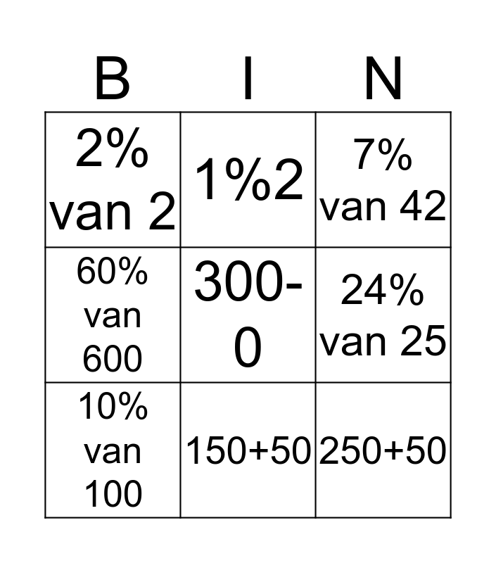 This bingo card has 9 words: 10% van 100, 7% van 42, 1%2, 60% van 600, 2% van 2, 24% van 25, 300-0, 250+50 and 150+50.