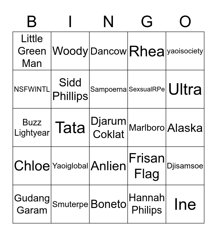 This bingo card has a free space and 24 words: Yaoiglobal, Smuterpe, Sampoerna, Gudang Garam, yaoisociety, Little Green Man, NSFWINTL, Woody, Marlboro, Anlien, SexsualRPe, Buzz Lightyear, Frisan Flag, Djisamsoe, Sidd Phillips, Hannah Philips, Alaska, Dancow, Ultra, Tata, Ine, Chloe, Rhea and Boneto.