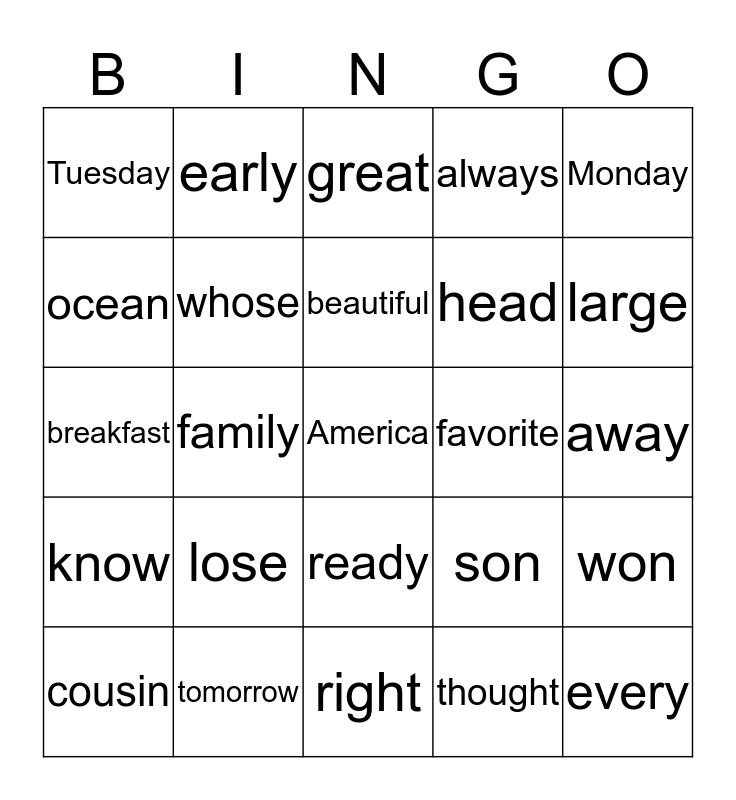 This bingo card has a free space and 24 words: lose, tomorrow, beautiful, cousin, Monday, Tuesday, ocean, early, favorite, ready, head, breakfast, son, won, whose, thought, away, great, large, family, every, know, always and right.