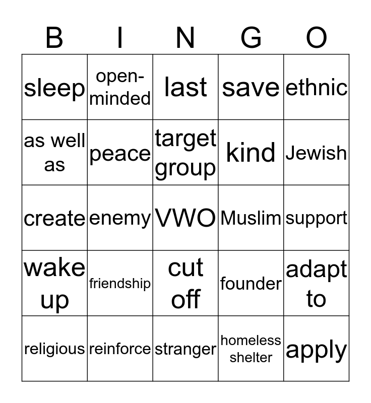 This bingo card has a free space and 34 words: atmosphere, homeless shelter, drop, belief, wake up, peace, ethnic, religious, open-minded, prejudice, target group, last, entire, break down, Muslim, Jewish, reinforce, create, friendship, founder, cut off, cabin, sleep, support, stranger, apply, save, eyesight, kind, as well as, well, enemy, adapt to and attitude.
