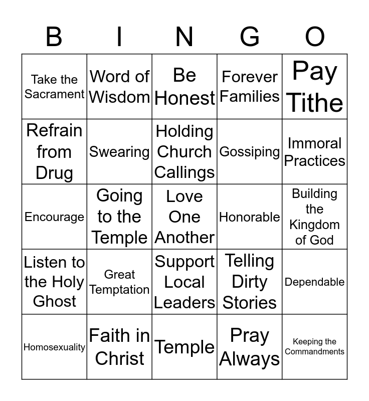 This bingo card has 25 words: Listen to the Holy Ghost, Faith in Christ, Love One Another, Pray Always, Pay Tithe, Take the Sacrament, Word of Wisdom, Be Honest, Honorable, Dependable, Refrain from Drug, Swearing, Temple, Telling Dirty Stories, Immoral Practices, Homosexuality, Going to the Temple, Holding Church Callings, Gossiping, Building the Kingdom of God, Encourage, Great Temptation, Support Local Leaders, Forever Families and Keeping the Commandments.