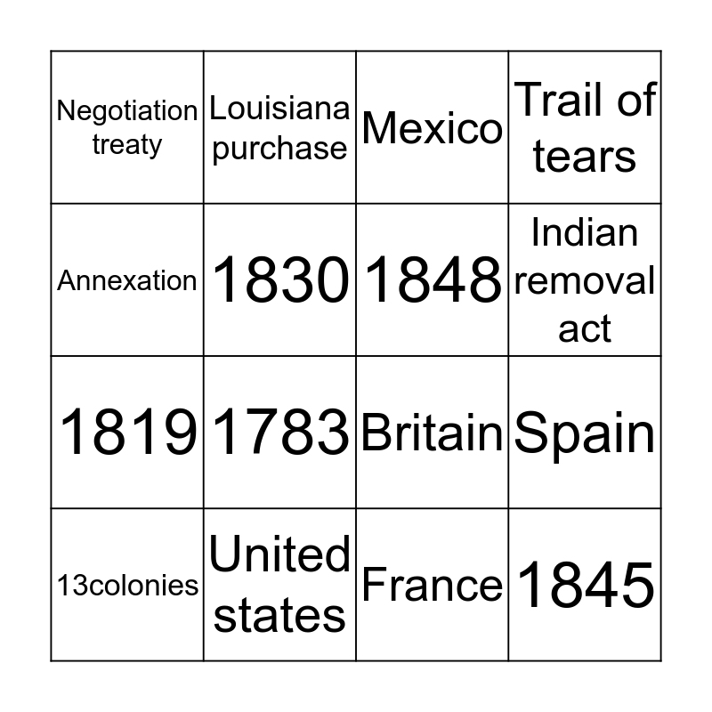 This bingo card has 16 words: United states, Spain, Mexico, Negotiation treaty, 1819, Louisiana purchase, Britain, France, Annexation, 1830, 13colonies, Trail of tears, 1783, Indian removal act, 1848 and 1845.
