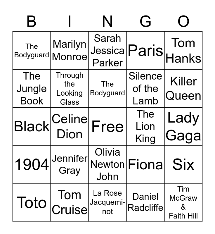 This bingo card has a free space and 24 words: Jennifer Gray, Tom Cruise, The Bodyguard, Toto, Tom Hanks, The Bodyguard, The Jungle Book, Marilyn Monroe, The Lion King, Olivia Newton John, Silence of the Lamb, Black, Fiona, Six, Through the Looking Glass, Daniel Radcliffe, Lady Gaga, Sarah Jessica Parker, Killer Queen, Celine Dion, Tim McGraw & Faith Hill, 1904, Paris and La Rose Jacquemi-not.