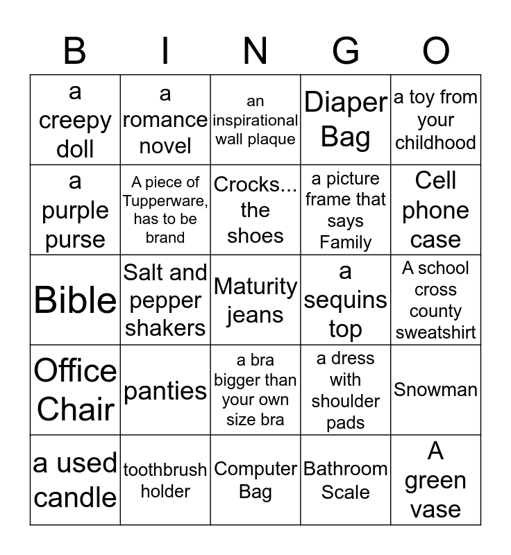 This bingo card has a free space and 24 words: panties, toothbrush holder, Crocks... the shoes, a used candle, a toy from your childhood, a creepy doll, a purple purse, a romance novel, a sequins top, a bra bigger than your own size bra, a picture frame that says Family, Bible, a dress with shoulder pads, Snowman, A piece of Tupperware, has to be brand, Bathroom Scale, A school cross county sweatshirt, an inspirational wall plaque, Cell phone case, Salt and pepper shakers, A green vase, Office Chair, Diaper Bag and Computer Bag.