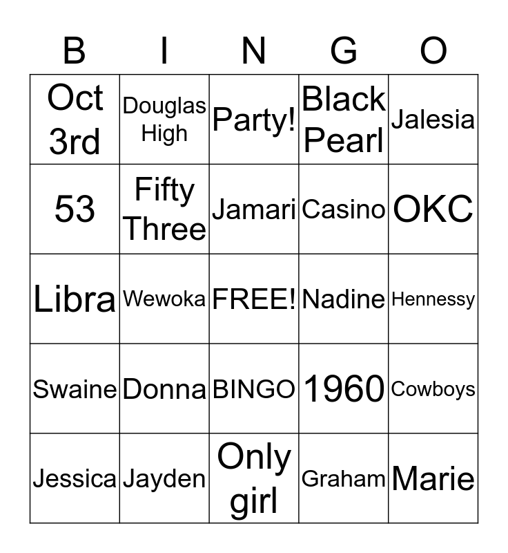 This bingo card has a free space and 24 words: Donna, Jayden, Jamari, Jessica, Jalesia, Oct 3rd, 53, Douglas High, Nadine, BINGO, Casino, Libra, 1960, Cowboys, Fifty Three, Graham, Hennessy, Party!, OKC, Wewoka, Marie, Swaine, Black Pearl and Only girl.